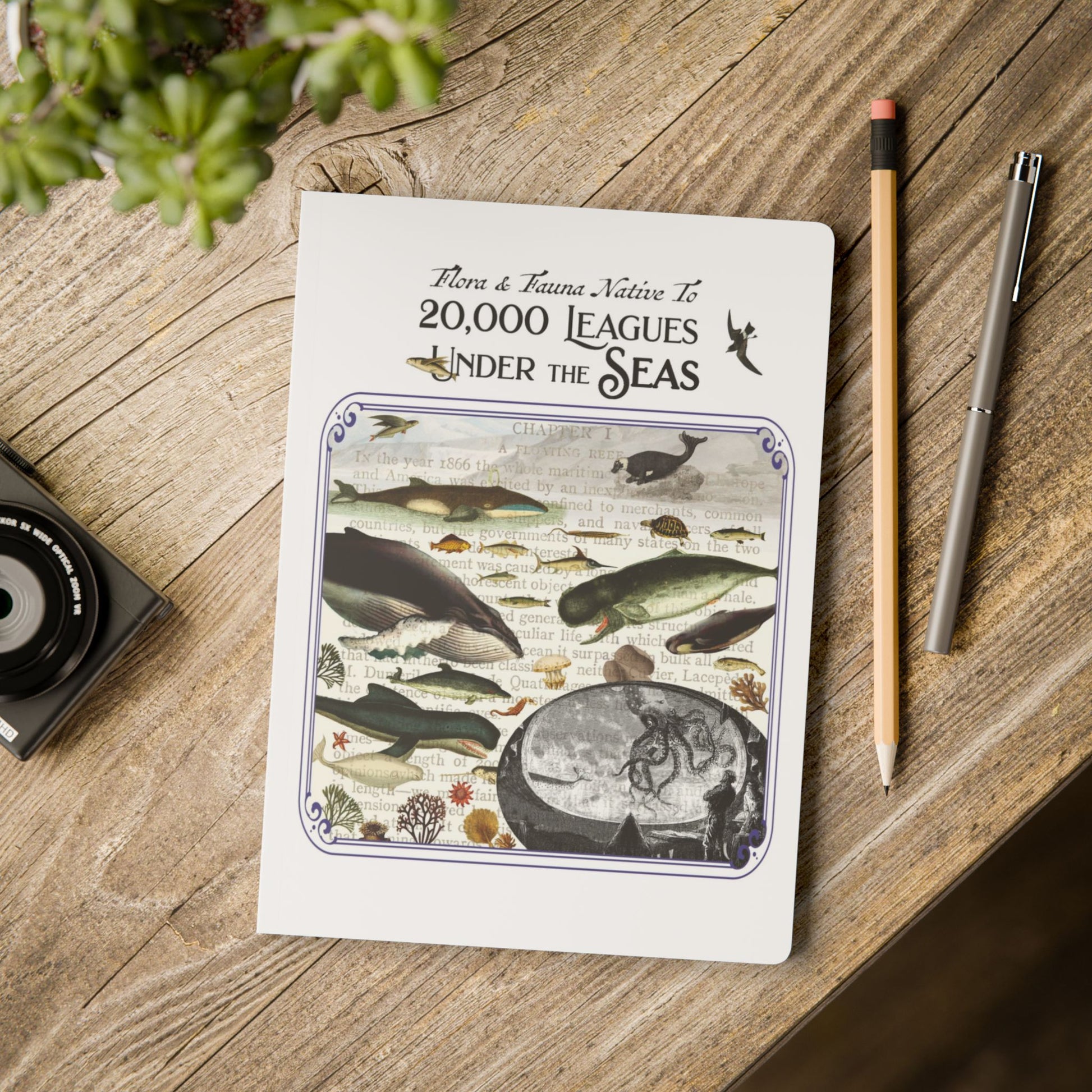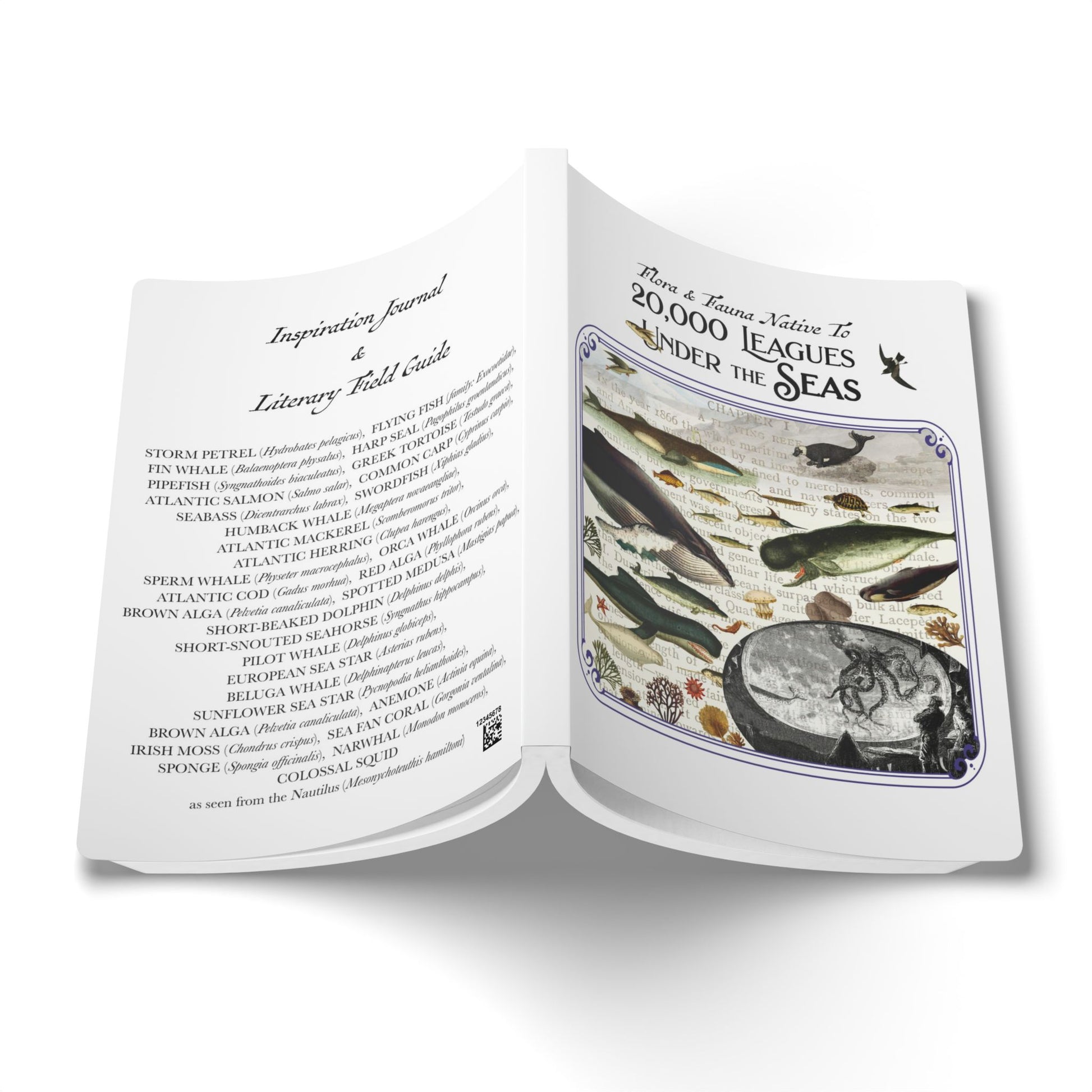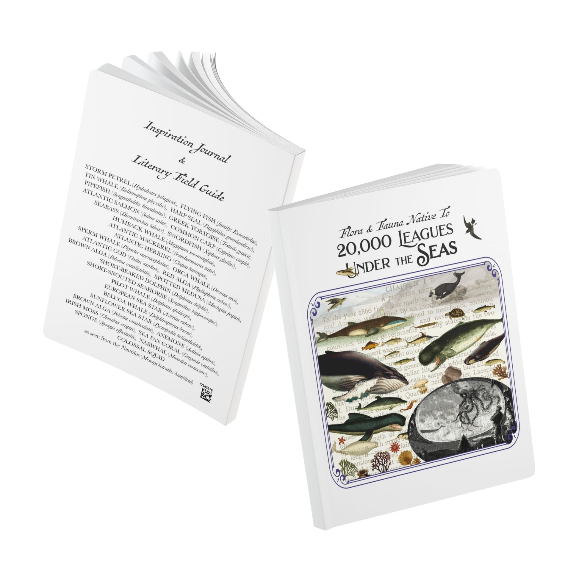Dive below the surface with this softcover inspiration journal inspired by Jules Verne’s 20,000 Leagues Under the Seas (as per the original French title). The front and back covers feature an original Natural History Collage drawn from the novel’s undersea world: marine life, exploration, and the quiet strangeness of the deep.