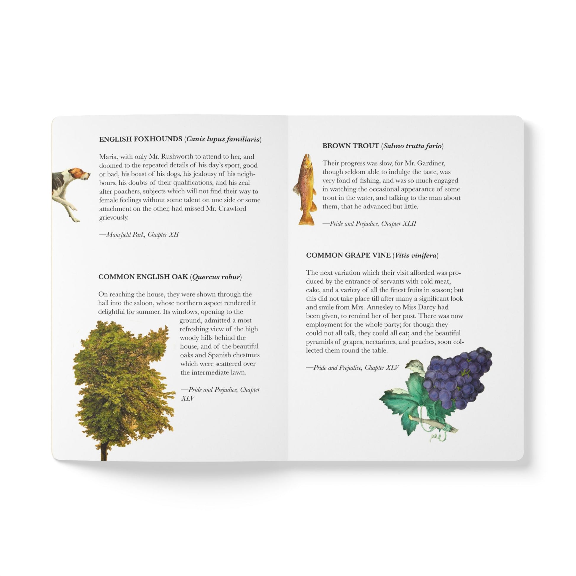 The front cover collage draws from the natural and domestic imagery that quietly grounds Austen’s writing: animals, gardens, fruit, and the cultivated landscapes that frame her characters’ lives. On the back cover, a thoughtfully assembled list of species mentioned across Austen’s novels forms a gentle natural-history counterpart to her social worlds.
