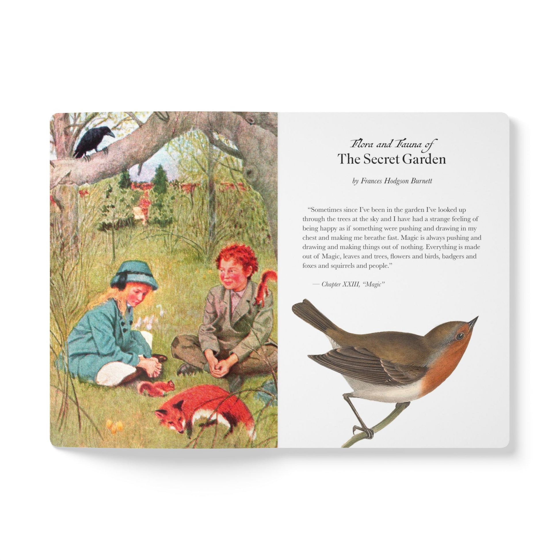 The front and back feature an original collage inspired by the beloved novel. Inside, the journal opens with vintage illustrations from a 1911 edition of The Secret Garden. The first three introductory pages pair excerpts from the book with vintage botanical artwork, creating a small literary field guide before the writing space begins.