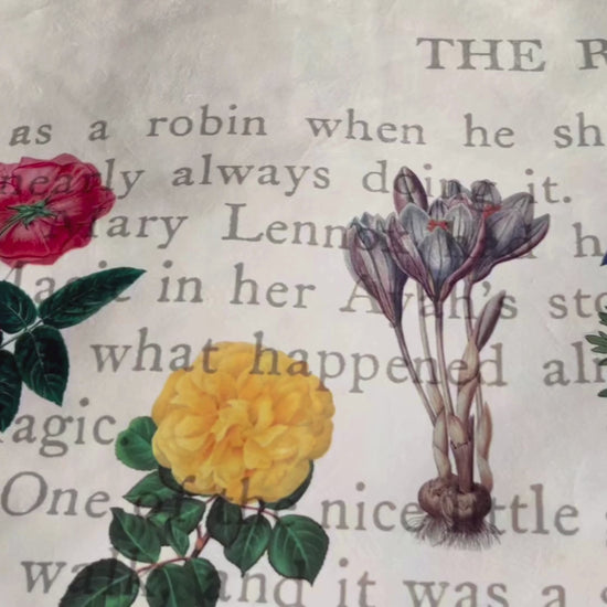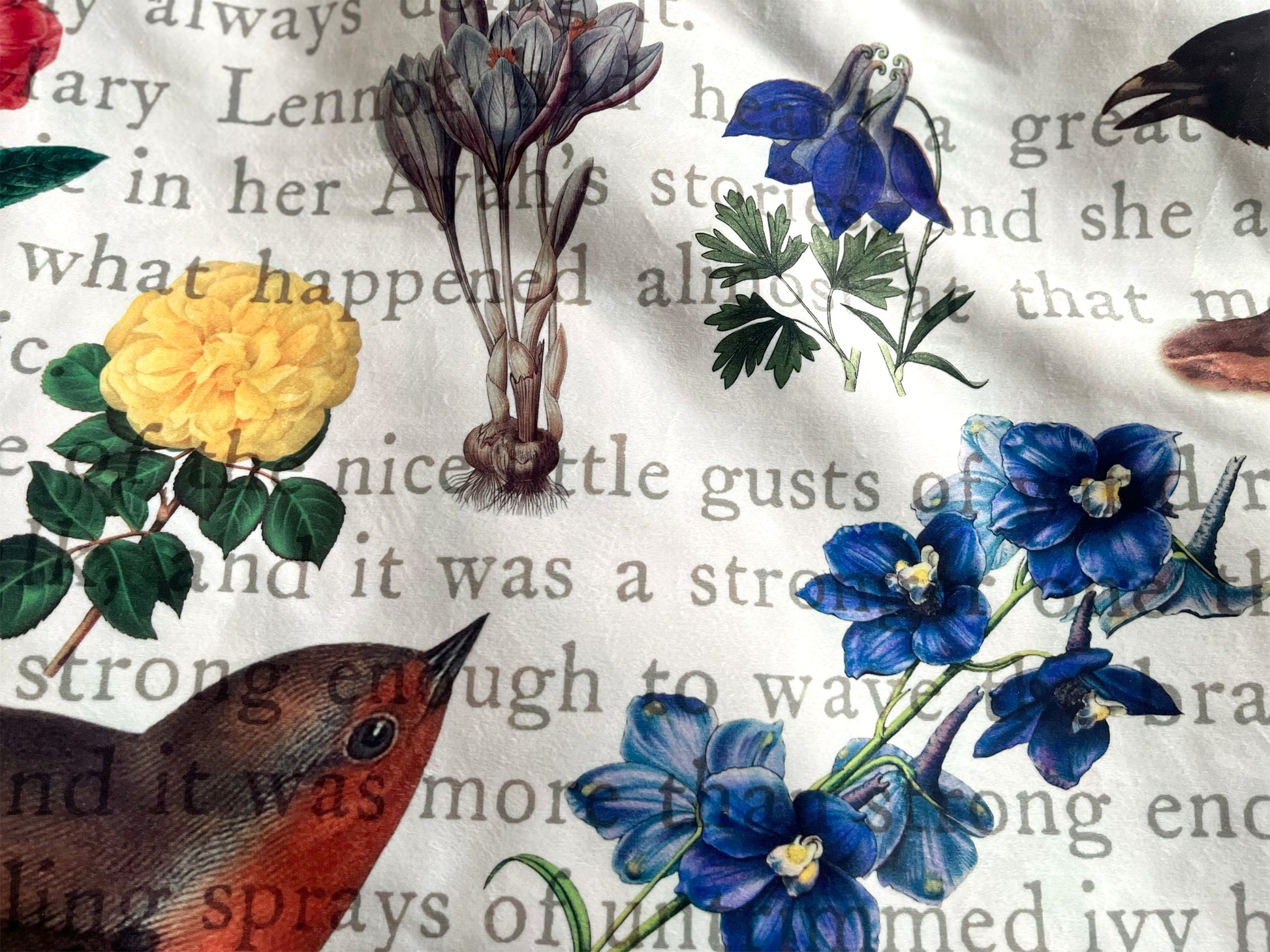 Inspired by The Secret Garden, this soft, fleece blanket features the page where Mary Lennox first discovers the hidden door to the garden. That original book text appears like a whisper behind the collage of vintage natural history illustrations of flowers, birds, and small woodland creatures found in the book.