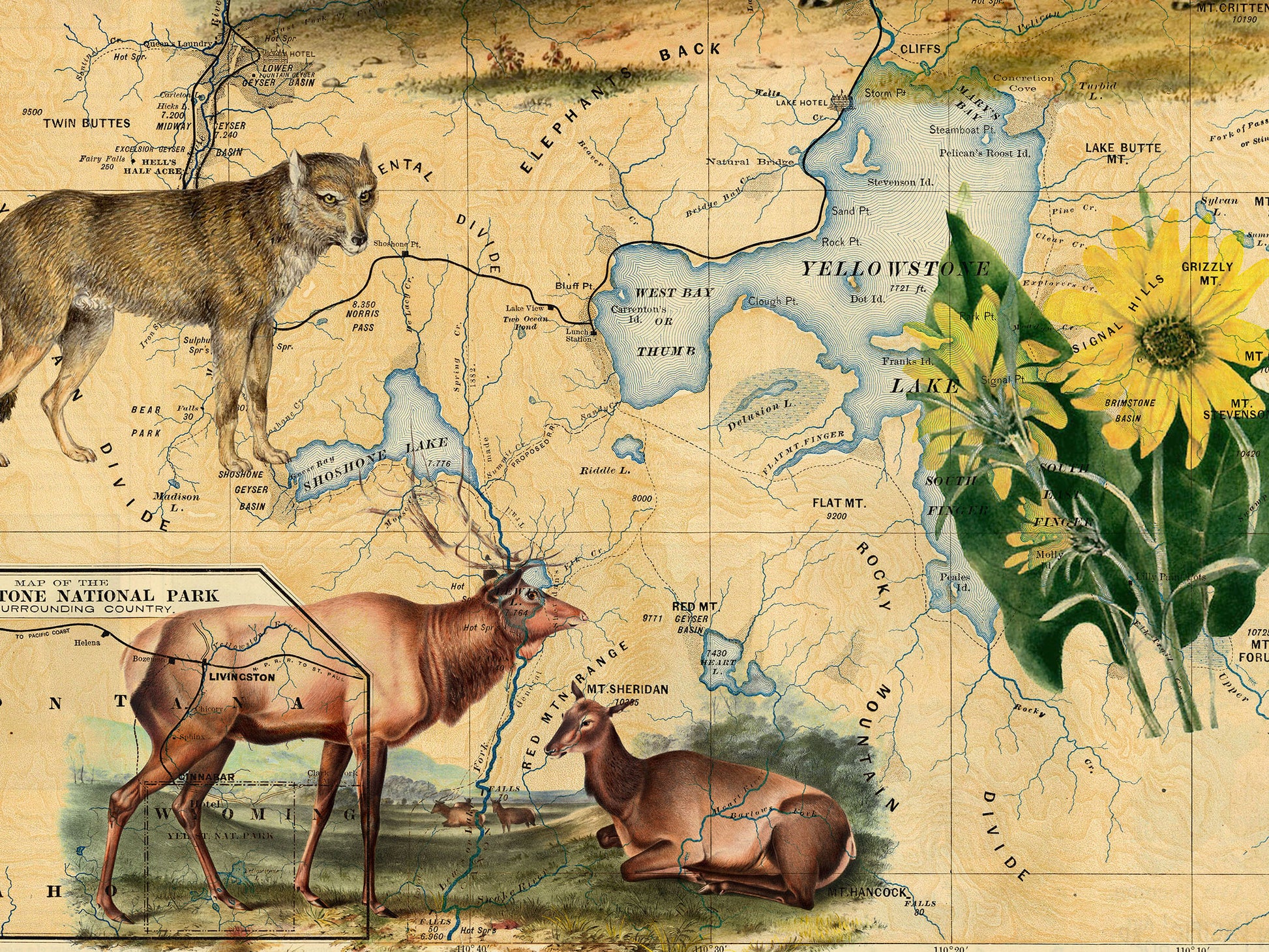 This wood print features our Yellowstone National Park field guide collage, with the artwork printed directly onto natural wood to create a warm, textured surface. The wildlife of Yellowstone National Park—from bison and wolf to the white pelican of Yellowstone Lake—appears with a subtle grain beneath the image, giving each piece a grounded, organic character.